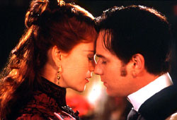 ジェットコースター的にズームするカメラ、作り込まれた架空のムーラン・ルージュ、そのボール・ルームで歌い踊る無数のカンカンガールとタキシード連中…、冒頭の怒涛のごとき大袈裟ぶりに、観客は否応なくバズ・ラーマンの劇的世界に引きずり込まれてしまう。その圧倒的なパワーの前には、リアリティなど何の意味もない。なかでもその奔放な飛躍は、音楽に如実に表れている。ありとあらゆるミュージカルの名曲から、マドンナやU2、T-REXに至るまでのラインナップと、それを歌う役者達のサービス精神旺盛なパフォーマンスには、いわゆるミュージカルのワザとらしさなど皆無だ。