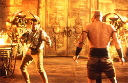 「最後の方で、今回新しく登場する敵と闘う場面があります。その敵、スコーピオン・キングをレスリング界の超人気者、ザ・ロックが演じているのも見所のひとつ。彼の本名はドゥエイン・ジョンソンというんですがとても良い人です」