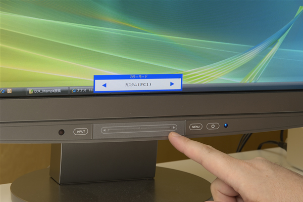 HD2451Wの場合、[MENU]→[カラー調整]→[カラーモード]の順で呼び出し、スライドバーで好みの表示モードを選ぶ。液晶パネル下のタッチボタン類を数度操作するだけなので、表示モードはすぐに変更できる。