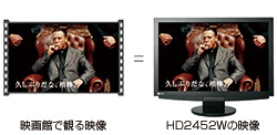 実際に映像を見てみた感じでは、画質の傾向は先代FlexScan HD2451Wとよく似ている。ハイコントラストでありながらも、過度な味付けを行わない、モニターライクで自然な色あい…すなわちナナオのいうところの「ナチュラルコンフォート」画質が実現されている。これはナナオが展開する液晶テレビ製品FORISの高画質化テクノロジーがそのままFlexScan HD2452Wに継承されていることの証でもある。