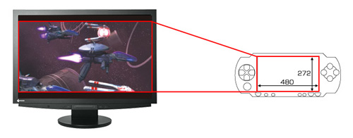 ※PSPの画面解像度が480×272ドットで、16:9なのに対し、FlexScan HD2452Wの画面解像度が1920×1200ドットで16:10のため、上下に若干の未表示領域が出ます。