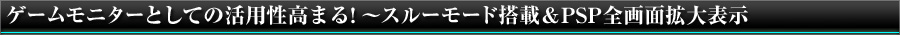 特殊画面サイズモードと言えば、PSPを接続したときの専用拡大モードも搭載されている。新型PSPには映像をテレビ出力する機能が搭載されたが、PSP側の問題で、メニュー画面こそテレビの画面一杯に表示されるものの、ゲーム画面は小さく表示されてしまうという機能制約があった。FlexScan HD2452Wには、このPSPのゲーム画面映像出力時に特化した表示モード「ポータブル」モードを備えており、一般的なテレビ製品では小さく表示されてしまうPSPゲーム映像を、なんと全画面拡大表示※することができるのだ。ちなみに、この機能、昨年、筆者がFlexScan HD2451W紹介記事でPSPを接続したときにボソっとつぶやいた要望であった。まさか対応してくれるとは思わなかった。ちなみに、こんなマニアックな機能を搭載しているモニターは世界で唯一、FlexScan HD2452W以外にはない。