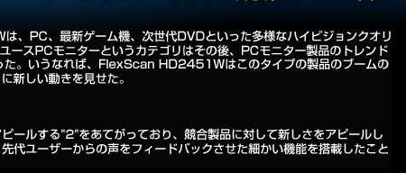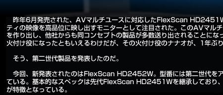 こうしてみてくると、追加機能項目だけをみれば、FlexScan HD2452WはFlexScan HD2451Wからのマイナーチェンジモデルということになるだろう。しかし、その追加された機能の全てがクリティカルに大きなユーザーメリットを生むものばかりなだけに、マイナーチェンジはマイナーチェンジでもビッグ・マイナーチェンジだといえる。FlexScan HD2452Wは、先代のヒット商品FlexScan HD2451Wの進化形であると同時に、AVマルチモニターの1つの完成形といえるかもしれない。