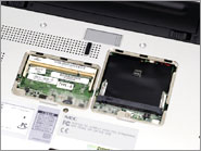 [▲クリックすると拡大します] 【Photo09】本体底面のネジを外すと簡単にアクセス可能。左がメモリ、右が無線LANである。無線LANは日本では電波法の絡みもあってそれほどminiPCIモジュール単体での入手性がよくない上に、5,250円(※価格は3月17日現在)でトリプルバンド品が入手できるから、一緒に買っておくのが絶対にお得である。