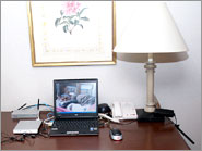 [▲クリックすると拡大します] 【Photo11】出張先のホテルの部屋で。スタンドライトの根元にコンセントがあるので、そこに直接ACアダプタを固定できる。