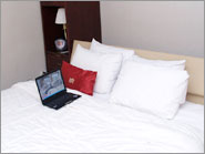 省電力モードの場合の発熱の少なさも、嬉しい点の一つ。出張先では、寝る際に枕もとにノートを置いておくことが多い。寝っ転がりながらメールのチェックができて便利なのだが、本来ノートはベッドの上において使うことを考慮していないケースが多いので、Photo12の様な置き方をすると朝にはマシンが結構熱くなっていることも多い。ところがLaVie G タイプJでは省電力動作にさせておけばそんな気配が微塵もないのは、やはり放熱設計がうまいせいだろうか? そんな使い方が悪い、と言われればそれまでなのだが、やはりちょっとLaVie G タイプJの省電力性が嬉しいところだ。