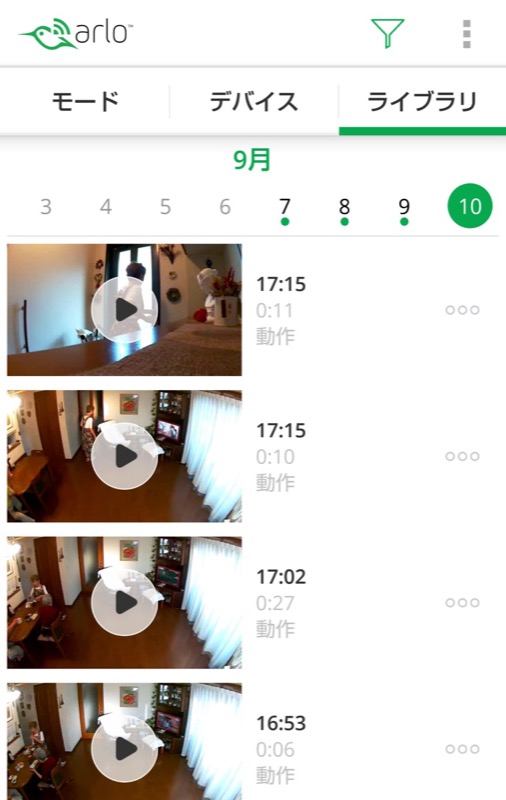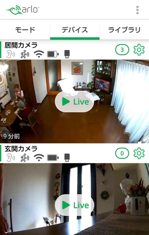 録画を開始する動きを検知すると、カメラ正面のオレンジのランプが点灯します。なお、映像解析はArloのサーバで行われるので、実際に動いてからランプが点灯するまでに、数秒〜数十秒かかる場合あります。