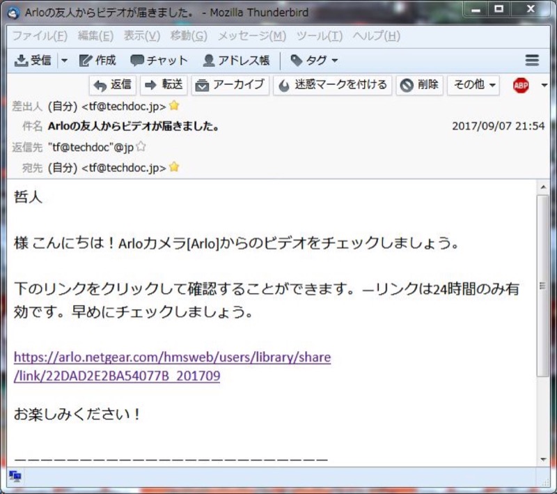 - リンク先が埋め込まれた文面が自動的に挿入された、新規メール編集画面が表示されます。共有したい人にメールを送信すると、24時間指定した映像が公開できます。