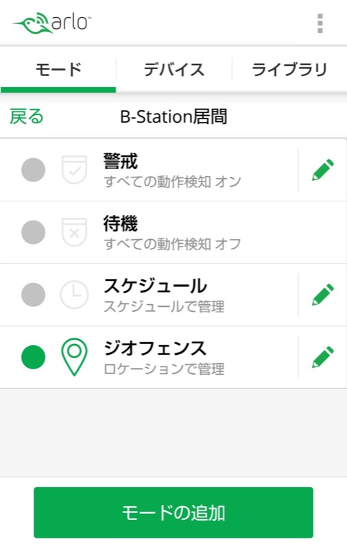 すでに自宅などの設定が終わっている場合は、「ジオフェンス」にタップするだけで、ベースステーションのモードが切り替わります。