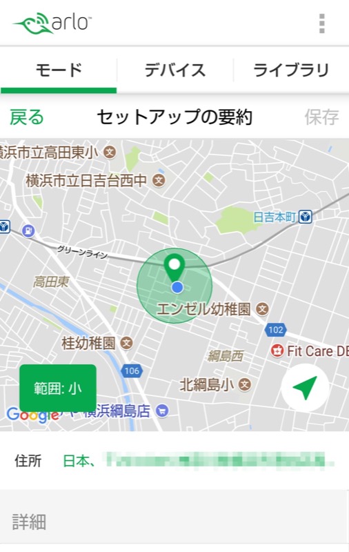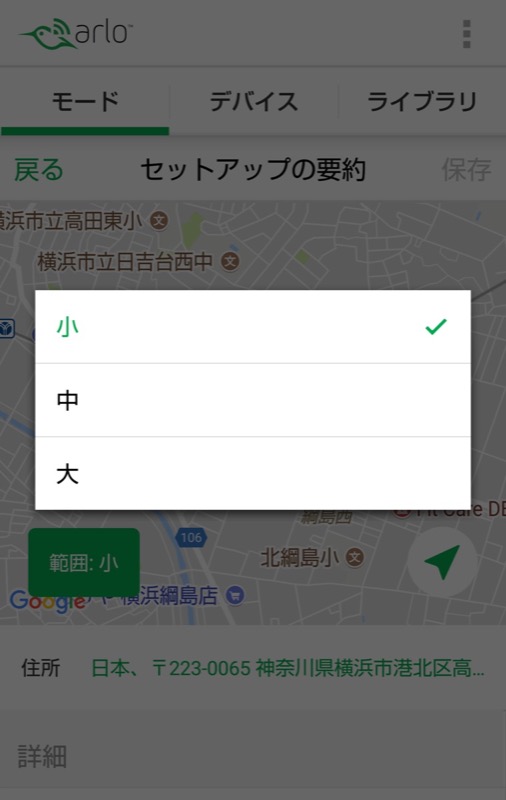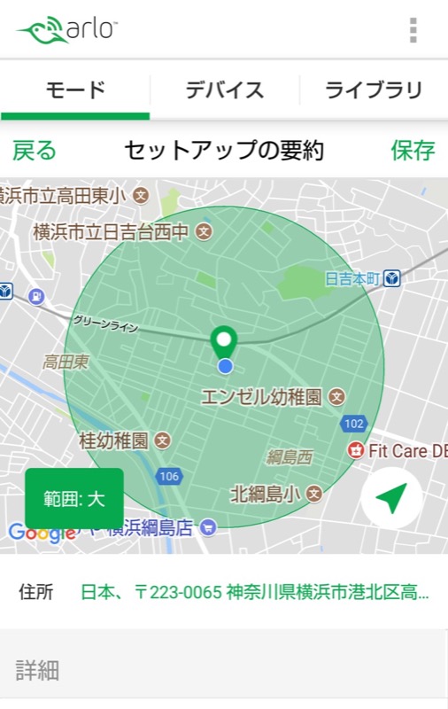 - その他細かな設定をします。自宅の範囲内にいるモード(通常は待機)と範囲外に出たモード(通常は警戒)などを指定します。最後に「完了」をタップします。