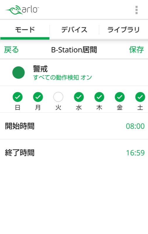 ベースステーションのモード(2017年9月現在は警戒モード固定です)、そのモードにする時間帯(開始と終了時刻、適応する曜日)を指定します。指定の時刻を過ぎると、ベースステーションは在宅を意味する「待機」モードになり、録画などを行いません。