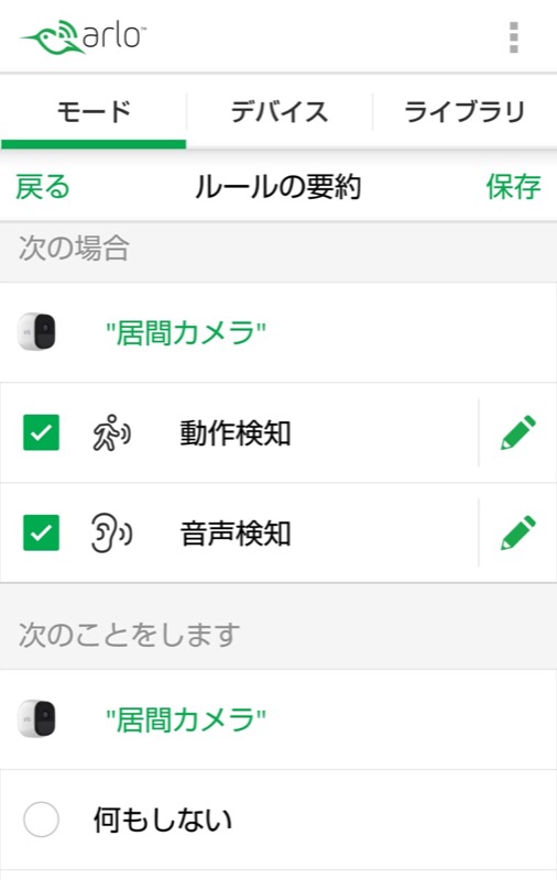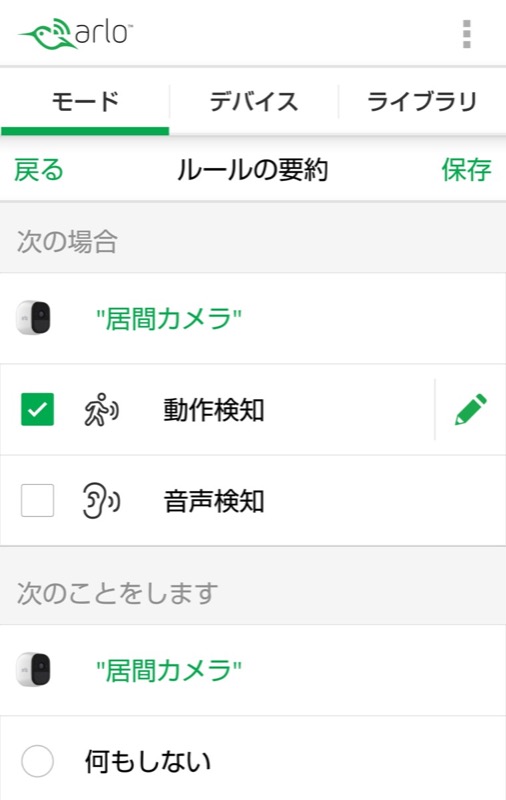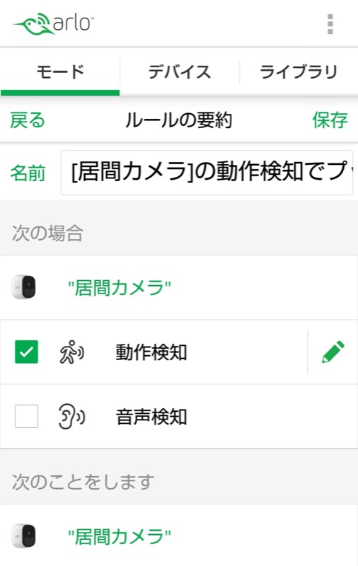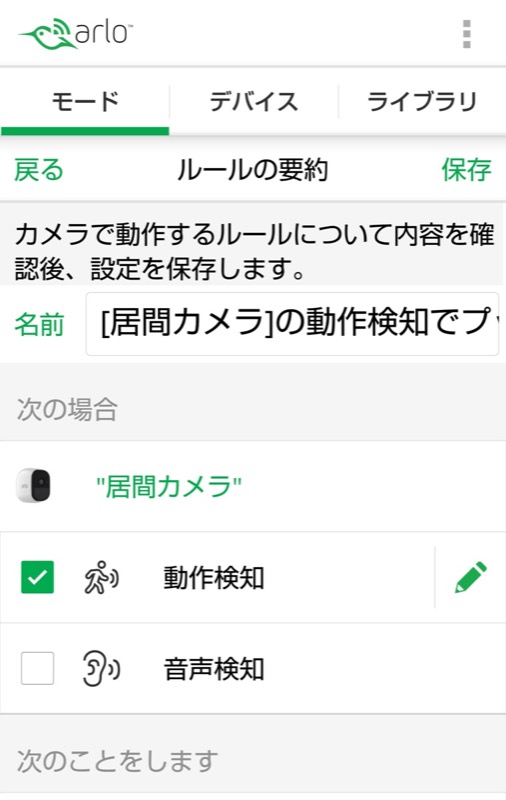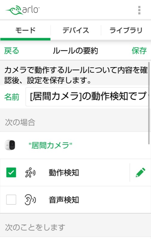 動作検知は映像に変化があった場合、音声検知は音声を検出した場合に、「次のことをします」で指定したアクションが実行されます。