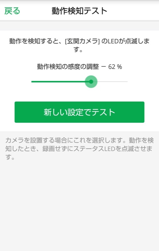 - 「動作検知の感度の調整」をスライドさせて「新しい設定でテスト」ボタンをタップします。