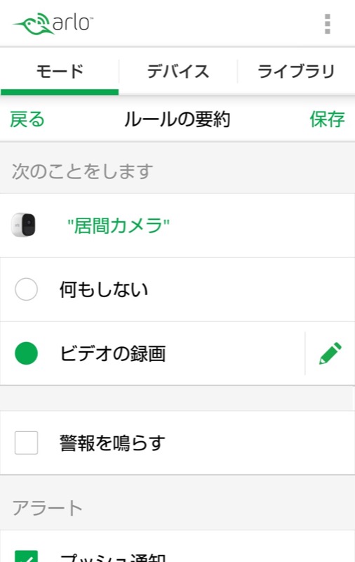 これでカメラが部屋の映像の検出したのをきっかけに、指定した録画や警報を鳴らすなどのアクションを設定できます。
