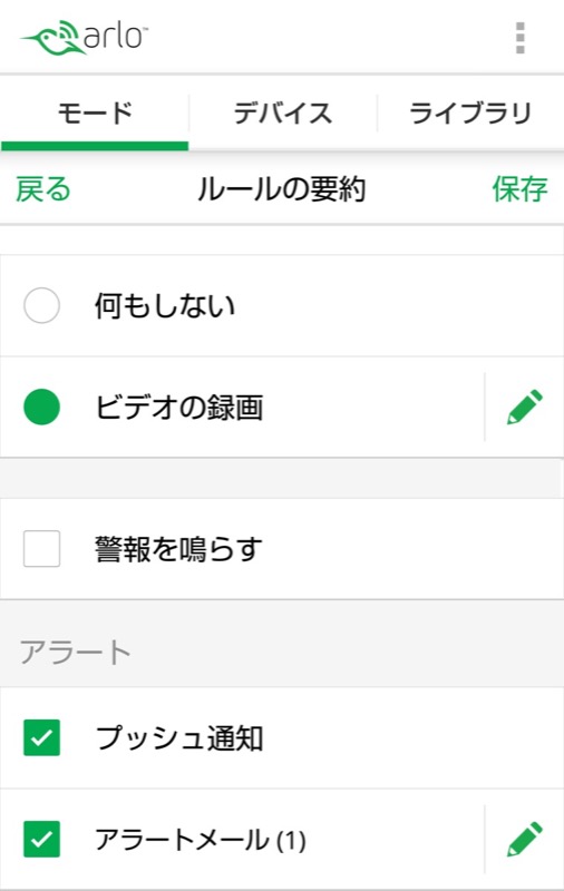 「プッシュ通知」をチェックすると、スマホにプッシュメッセージを送信します。「アラートメール」をチェックすると、指定したメールアドレスに動きがあったことをお知らせするメールを送信します。