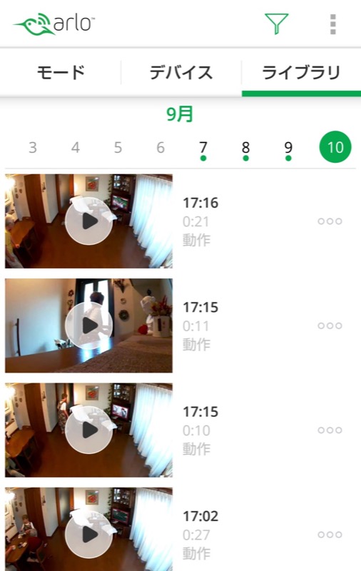 - メニューリボンから「ライブラリ」を選びます。 一覧に表示されている画像やムービーは、すべてArloのサーバに記録されているものです。