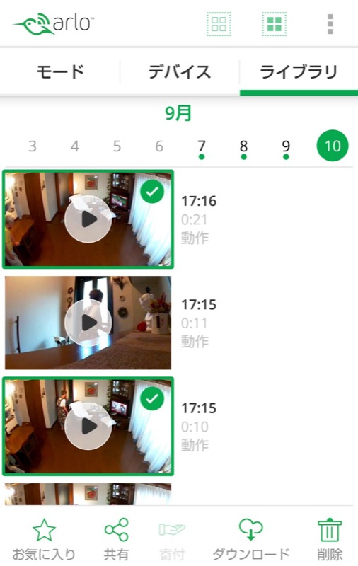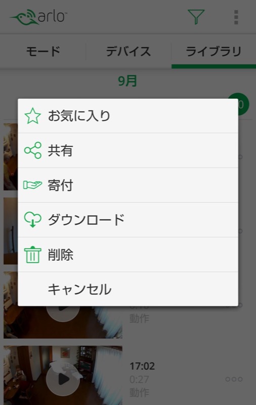 ライブラリで表示できる映像や画像は、Arloのサーバに保存されています。自分のスマホやパソコンのディスクに映像をコピーして、いつでも見られるようにするにはダウンロード機能を使います。