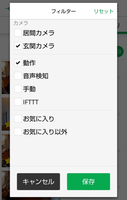 ・動作:以降4つは、録画するきっかけを選べます。動作は映像の変化を検知して録画開始したものに絞り込みます。