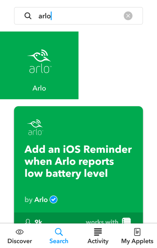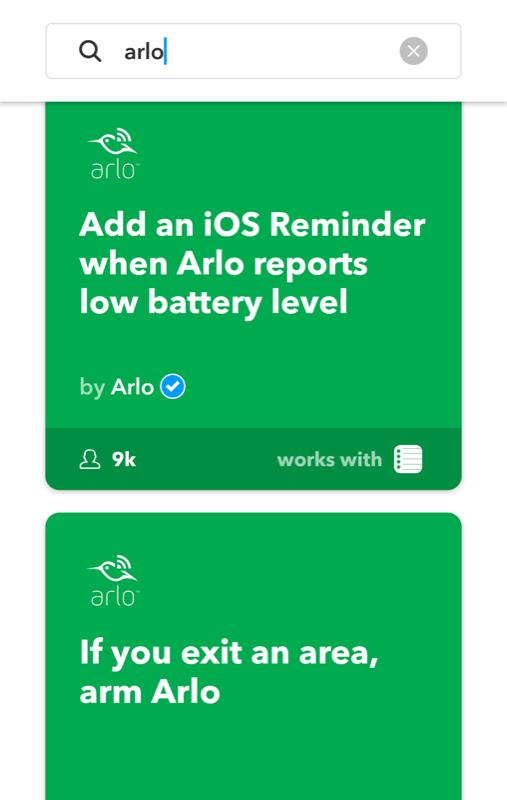 アプレットとは、あらかじめ作られている雛形です。一覧には「Arlo」のカメラのバッテリー残量をiPhoneなどApple系のリマインダーに登録する機能や、Arloのカメラが部屋で動きを感知すると、フィリップス社製のIoT対応LED電球を点灯したりできます。アプレットの例としては下記のようなものがあります。