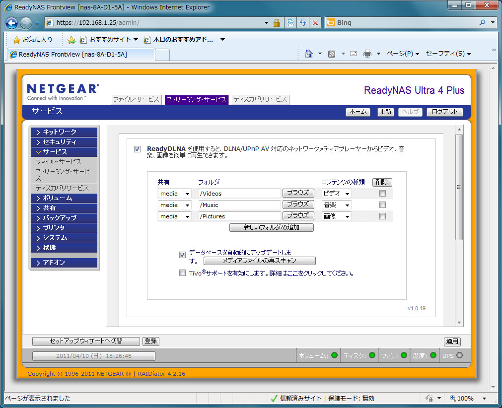 使い方は簡単だ。「ReadyNAS Ultra Plus」の設定画面にアクセスし、「サービス」の「ストリーミング・サービス」を開き、ReadyDLNAを有効にする。その後、公開したいフォルダを選択し、実際に画像や映像、音楽などのファイルを保存しておけばいい。