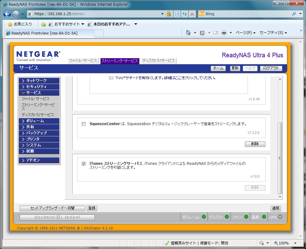 このほか、音楽の管理にiTunesを利用しているのであれば、「ReadyNAS Ultra Plus」のiTunesストリーミング・サーバ機能を利用するのもひとつの手だ。iTunesストリーミング・サーバ機能を有効にすると、「ReadyNAS Ultra Plus」保存された音楽をネットワーク上のiTunesに配信することができるようになる。家族みんなで音楽を共有したり、WindowsやMacなど、複数のPCがある環境で、それぞれのPCから同じ音楽を楽しみたいときに便利だ。