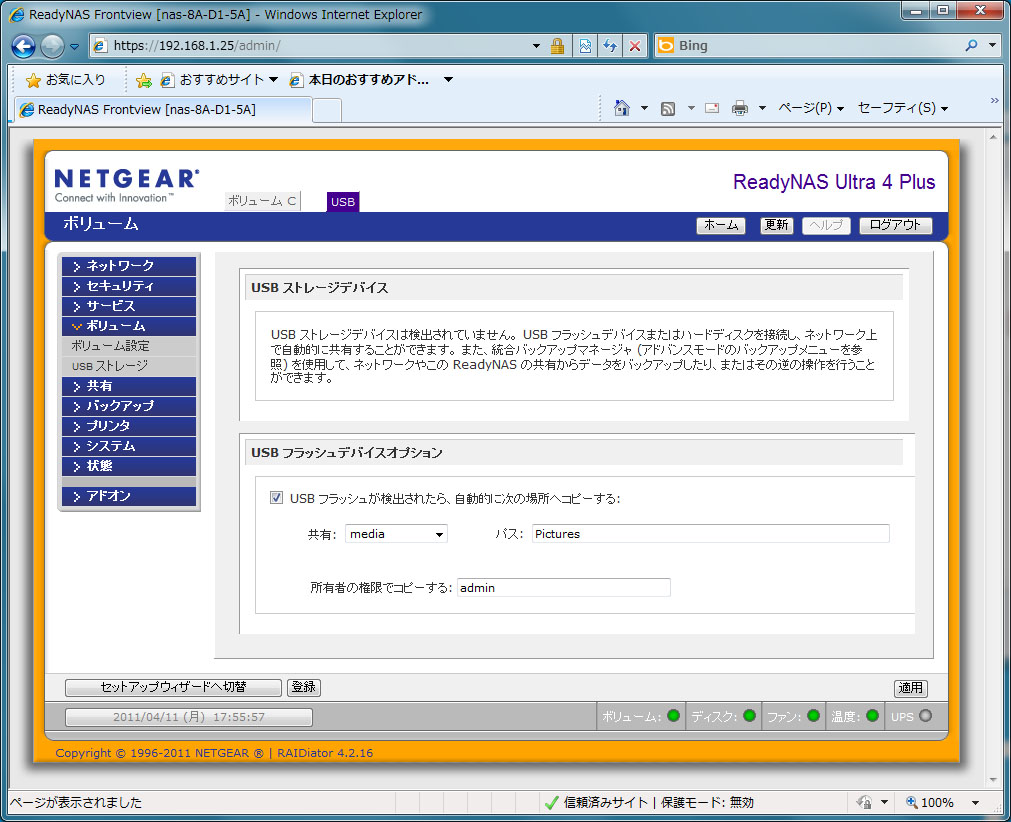 「ReadyNAS Ultra Plus」の設定画面にある「ボリューム」から「USBストレージ」を選択し、USBフラッシュデバイスオプションで、USBフラッシュデバイスが接続されたときに保存されているファイルを自動的にコピーする先を設定しておく。