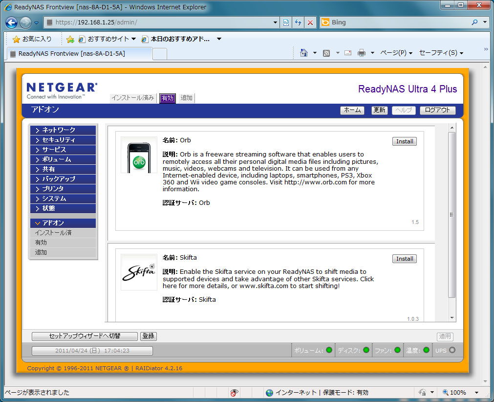 新しいアドオンは「追加」、もしくは「有効」からインストールする。「追加」を選びたくなるところだが、「追加」の場合、アドオンのサイトなどからあらかじめプログラムをダウンロードしておき、それを「ReadyNAS Ultra Plus」にアップロードして追加する方法となる。言わば手動インストールだ。orbのような定番的なアドオンは、ダウンロードやインストールがほぼ自動的にできるように「有効」にあらかじめ登録されているので、こちらからインストールするのがおすすめだ。