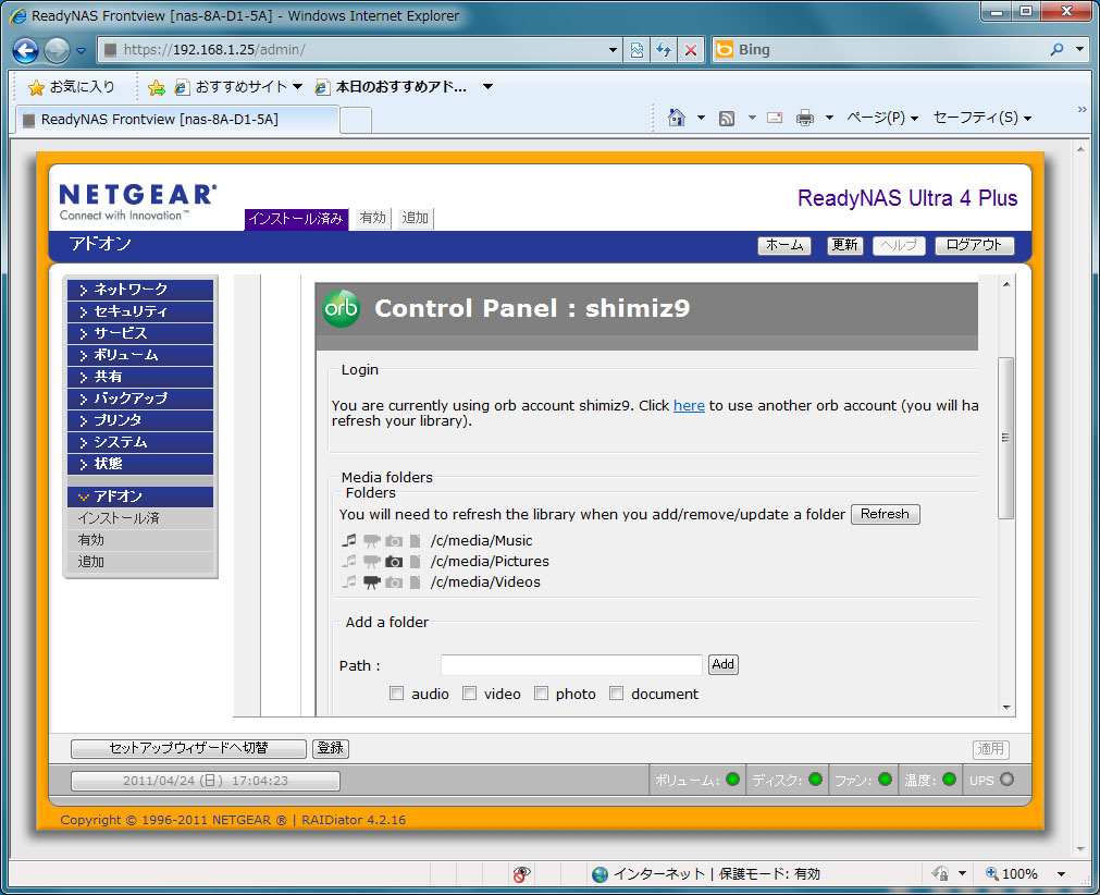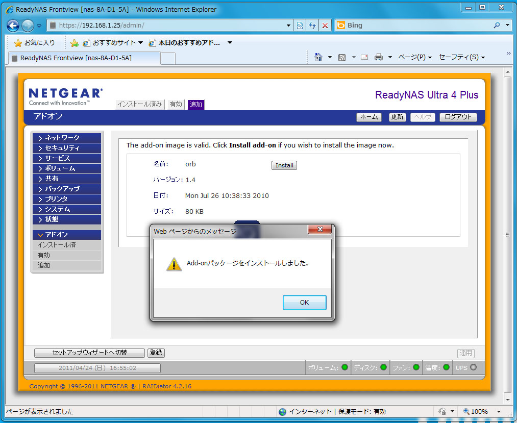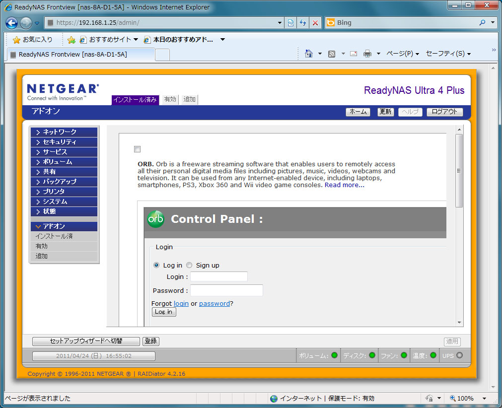 最後に、アドオンを有効にするために、「orb」の名称の前にあるチェックボックスにチェックを入れておけば、「ReadyNAS Ultra Plus」側の設定は完了となる。