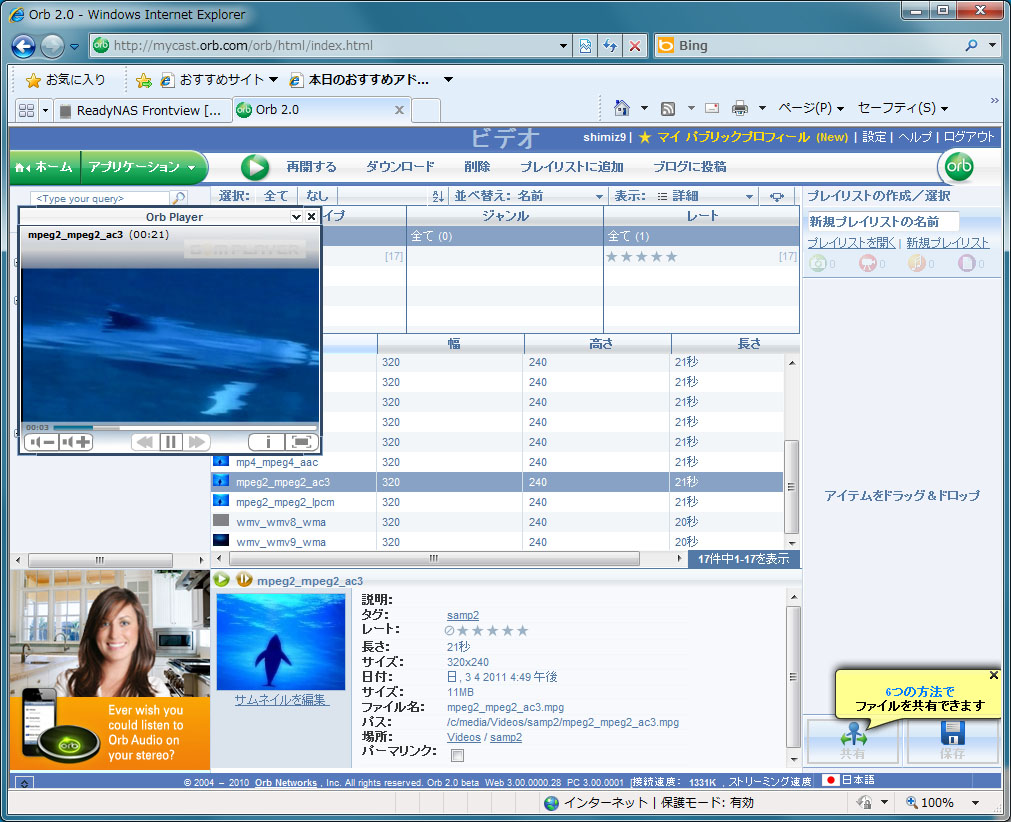 orbは、音楽やビデオなどのメディアファイルをストリーム配信することができるメディアサーバーソフトだ。メディアの配信ということでは、前回紹介したDLNAサーバー機能(ReadyDLNA)も同様の機能と言えるが、ReadyDLNAがLAN内のDLNA対応機器に対してメディアを配信する機能であるのに対して、orbはインターネット経由であらゆる場所に存在する機器に対してメディアをストリーム配信することができる機能となっている。