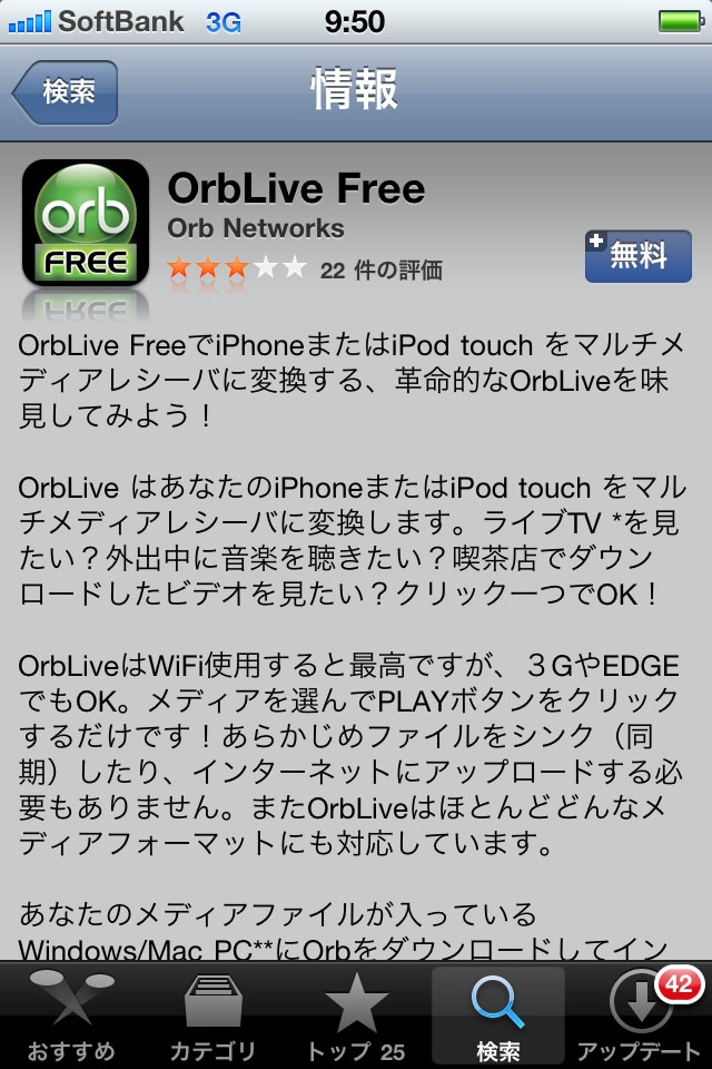 もちろん、スマートフォンからの利用も簡単だ。iPhoneやiPadの場合はAppStoreから、Androidの場合はマーケットから、「OrbLive」と検索すると、対応アプリをダウンロードすることができる。