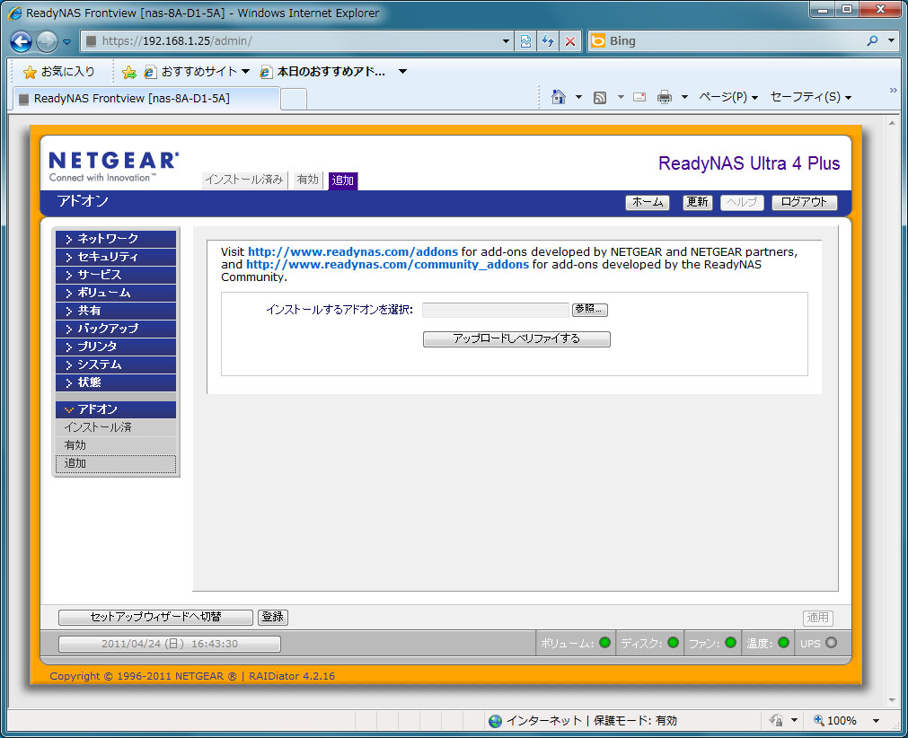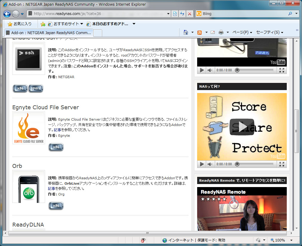 設定画面の「アドオン」にある「追加」に表示されているリンク(http://www.readynas.com/addons、もしくはhttp://www.readynas.com/community_addons)をクリックすると、アドオンの紹介サイトが表示される。標準では言語が英語になっているので、日本語で表示し直すか、以下のURLにアクセスすると日本語のサイトが表示される。