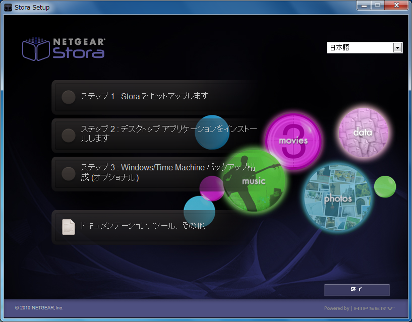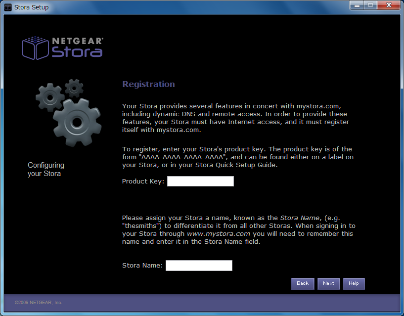 起動後、付属のCDからセットアップを実行。ウィザードに従って、CDケースに記載されているプロダクトキーとStora(ストラ)に付ける名前を設定後、管理用のユーザーアカウントを登録する。