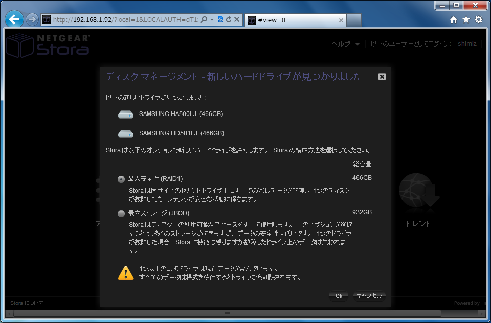 その後、デスクトップアプリケーションをインストールし、設定画面を表示すると、装着したディスクが認識されるので、その構成を選択する。Stora(ストラ)では2つのベイに装着したハードディスクをRAID1、もしくはJBODで構成できる。容量を重視するならJBODでもかまわないが、大切なデータを保護したい場合はRAID1を選択しておくといいだろう。