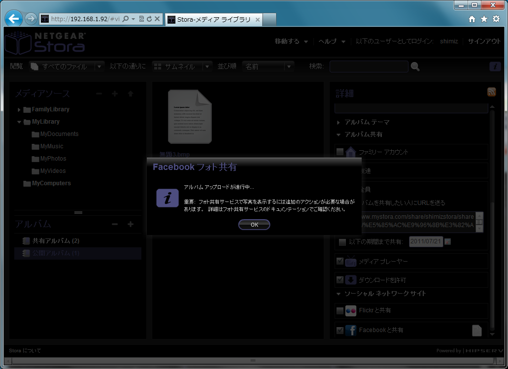 このほか、FacebookやFlickrとの連携も可能となっており、作成したアルバムの詳細設定画面で、「ソーシャルネットワークサイト」を選択すると、アルバムに登録した写真をFacebookのアルバムと同期させることができる。こうしたインターネット上のサービスとの連携は、「ローカルの存在」というこれまでのNASの常識を覆す画期的な機能と言えるだろう。