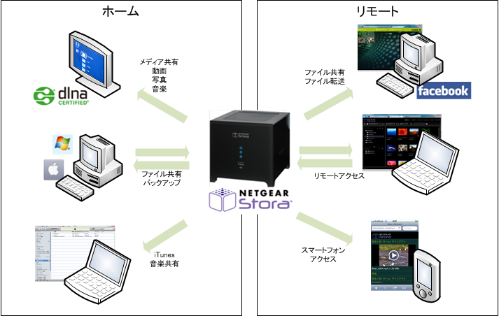 つまり、Stora(ストラ)を利用してデータを集中管理しておけば、そのデータをLAN内のPCだけでなく、家庭用テレビ、ゲーム機、iTunesなどから楽しんだり、さらに外出先のPC、スマートフォンなどからも利用できるというわけだ。