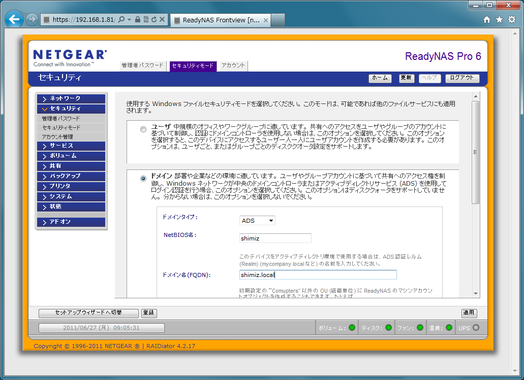 標準では「ユーザ」モードになっているが、設定ページの「セキュリティモード」で「ドメイン」を選択し、参加するドメイン名や管理者のアカウントなどを設定すると、既存のWindows Serverドメインに接続し、ADに登録されているアカウントを「ReadyNAS Pro」から参照できるようになる。