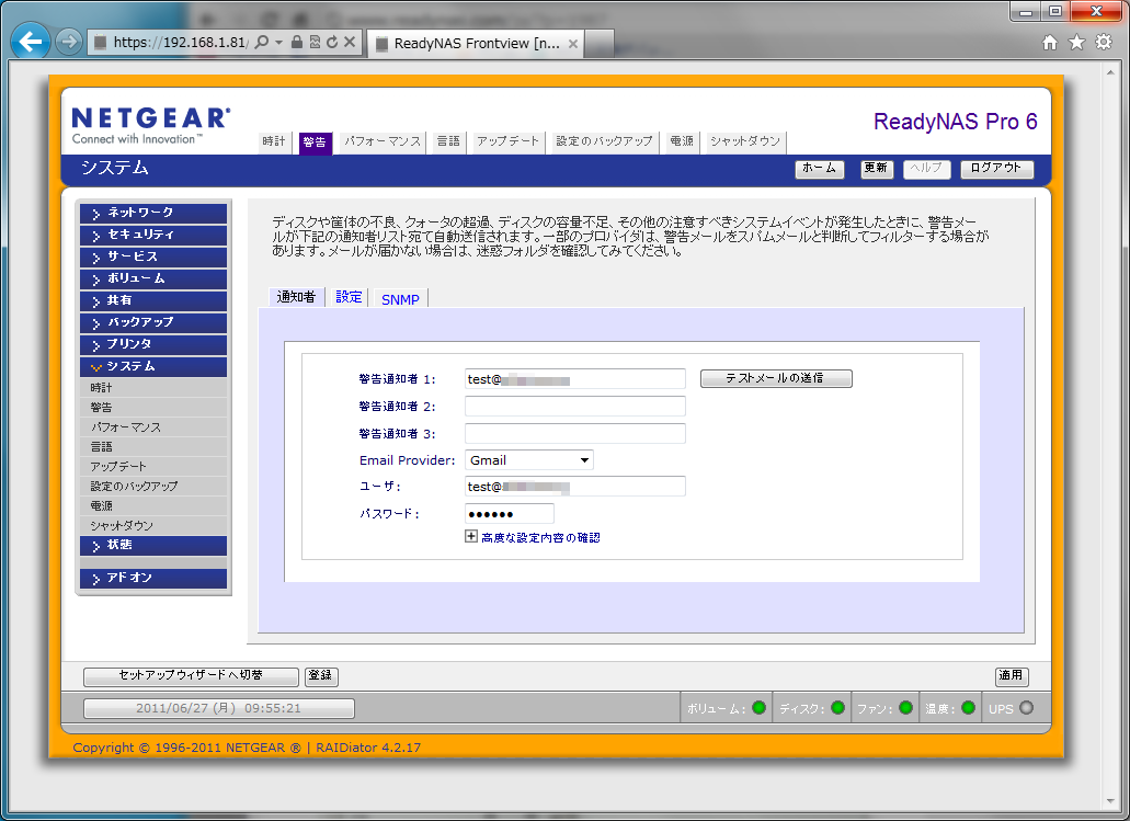 この機能は、非常に手軽に設定できるのが特徴だ。一般的なメール警告機能と同様に、「ReadyNAS Pro」内部のSMTPサーバーを利用したり、カスタムで外部のメールサーバーやポートを手動で指定することもできるが、警告の送信に「Gmail」などを指定することが可能となっており、サーバーやポートなどの面倒な設定をしなくて済むように工夫されている。
