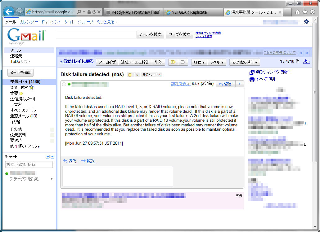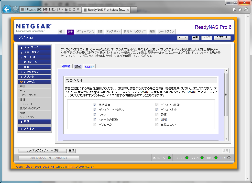 このような障害報告機能として、「ReadyNAS Pro」には、SNMPによるネットワーク監視機能もサポートされているが、より手軽な監視方法として、ディスクやファンの障害、ディスク容量の不足などの情報をメールで送信する機能を搭載している。