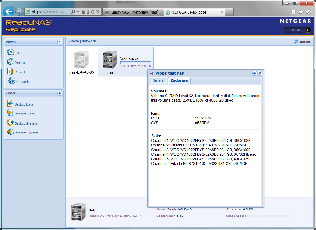 なお、余談だが、以前に紹介した「ReadyNAS Replicate」を利用すると、インターネット上のWebページに拠点ごとの「ReadyNAS Pro」をグラフィカルに表示し、プロパティからディスクの温度や状態などを確認できる。こういった機能と組み合わせることで、遠隔地の管理も効率的にできるだろう。