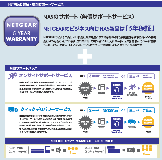 ホーム向けの「ReadyNAS Ultra 4 Plus」などは本体3年保証となっているが、ビジネス向けの「ReadyNAS Proシリーズ」や「ReadyNAS 2100/3100/3200/4200」は、保証期間が5年と長く設定されている。