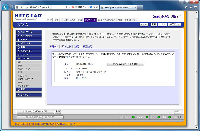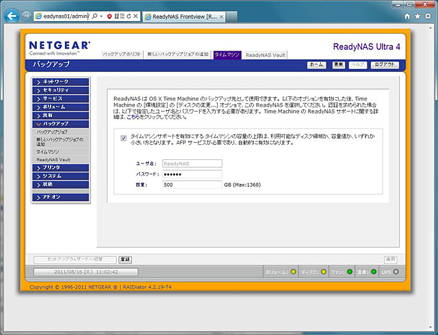 そんな中、OSX Lionの仕様変更に当初から対応していたのが、ReadyNASシリーズをリリースしているNETGEARだ。OS X Lionが正式リリースされた7月20日に先立つこと6日、7月14日にすでに対応版のファームウェア(RAIDiator 4.2.18)を公開し、OS X LionのTime Machineに対応していた。この対応の早さは数多のNAS製品の中でも群を抜いていたと言えるだろう。