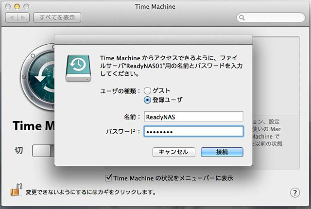 設定が完了したら、Mac側でTime Machineの設定をする。Time Machine環境設定を開き、「ディスクを選択」で「ReadyNAS」を選択すると、ユーザー認証の画面が表示されるので、ユーザー名「ReadyNAS」、パスワードに設定した値を入力する。