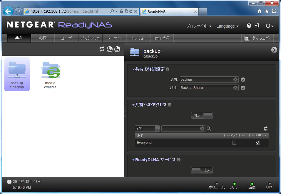 アクセス権の設定などもわかりやすく、フォルダを選択後、右側の一覧で共有へのアクセスをオン/オフしたり、ユーザーごとのリード/ライト権限を選択したり、DLNAサービスをオン/オフできるなど、設定に迷わないような工夫がなされている。