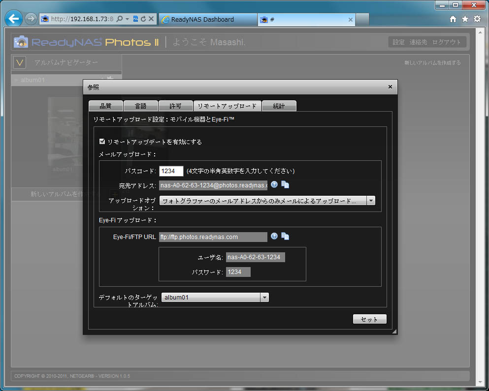 このほか、Eye-Fiにも対応しており、リモートアップロードの設定を有効にすることで、FTPのアドレスが有効になり、自動生成されたユーザー名とパスワードを使って、撮影した写真をEye-FiからダイレクトにReadyNASに保存することも可能となっている。