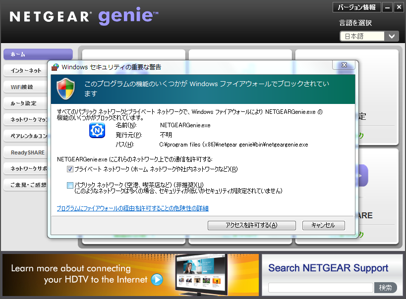 インストール完了後、初回起動時はWindowsファイアウォールの設定が必要になる。ルーターの状態を取得する際に通信が必要になるので、Windowsファイアウォールの画面がポップアップ表示されたら「デスクトップ NETGEAR Genie.exe」であることを確認して、アクセスを許可しておこう。