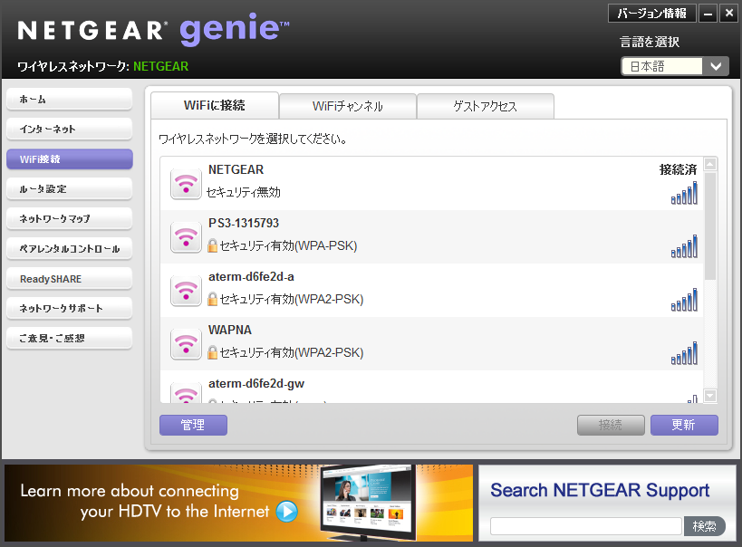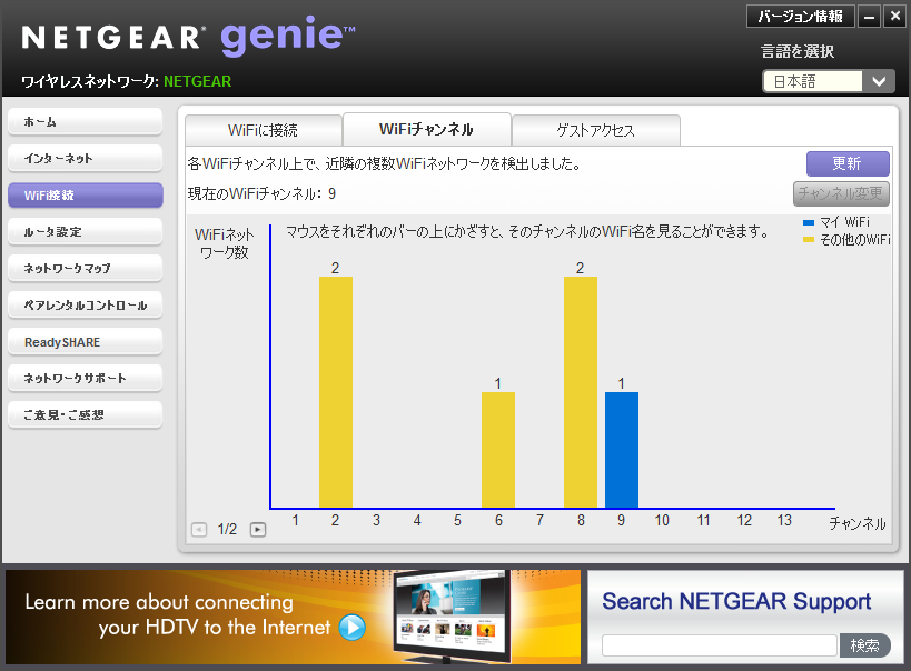 続いて、「WiFi接続」は、無線LANの接続を管理するための機能だ。無線LANの接続(手動接続)はもちろんのこと、近隣の電波状況をチェックできる機能が搭載されているため、干渉を避けてチャネルを設定することができる。