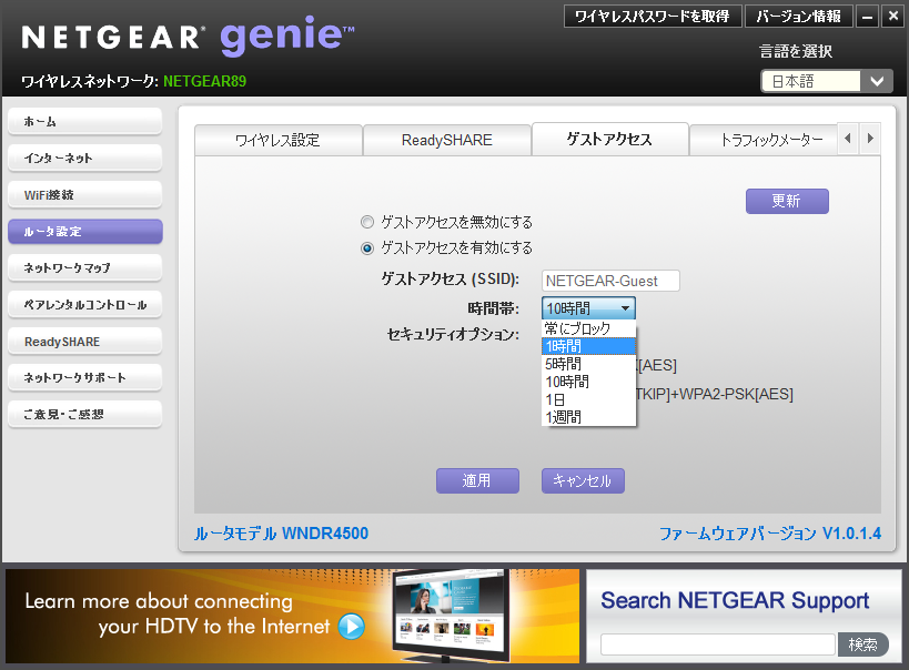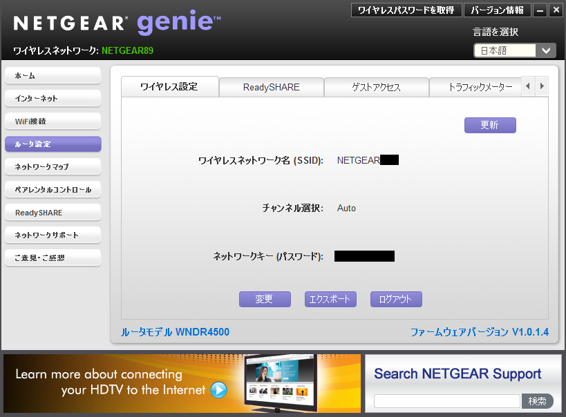 もちろん、ルーターの設定も管理することができる。「ルータ設定」を利用すると、ワイヤレス設定でSSIDやネットワークキーを確認することができるうえ、前述したゲストアクセスなどの機能の設定もできる。設定できる機能は最低限のものに限られているので、すべての設定を変更するにはブラウザからアクセスする必要があるが、デスクトップ NETGEAR Genieを使えば、よく使う機能に迷わず、素早くたどり着くことができる。