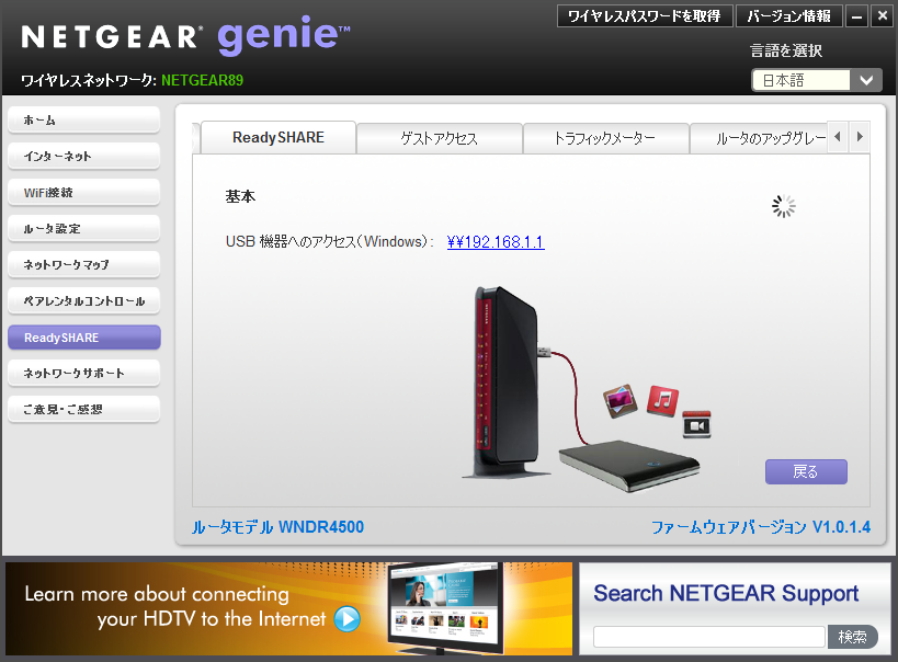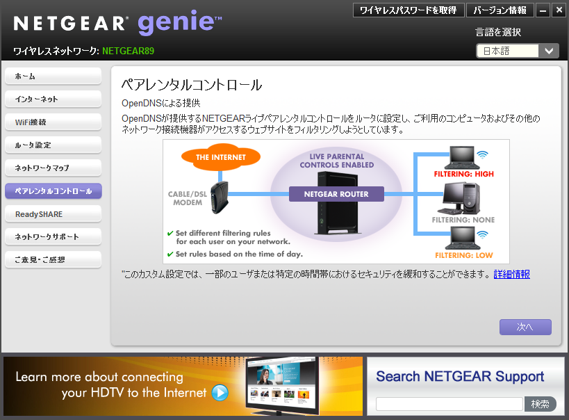 最後の2つ、「ペアレンタルコントロール」と「ReadySHARE」も、対応機種のみで利用可能な機能だ。ペアレンタルコントロールはいわゆるウェブフィルタリング機能で、これを有効にすることで特定のPCから悪質なサイトにアクセスすることを禁止できる。一方、「ReadySHARE」はUSBポートを搭載したルーター向けの機能で、USBストレージのデータを共有したり、USBプリンターを利用することなどができる。ウィザード形式で設定できるので、これも初めて利用する人にはありがたい機能だ。