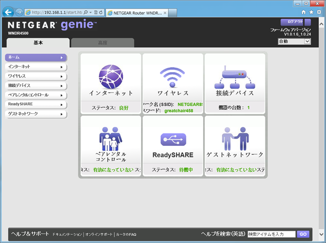セットアップも手軽にできるように工夫されている。ケーブル類を接続して起動後、LAN接続したPCでブラウザを起動すると、自動的に「NETGEAR genie」と呼ばれる設定画面が表示される。