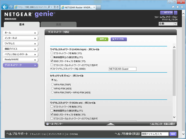 もちろん、高度な設定もできるようになっている。たとえば、無線LANに関しては、2.4GHz帯用のSSID(NETGEARxx)と5GHz帯用のSSID(NETGEARxx-5G)が標準で登録されているが、これに加えて「ゲストネットワーク」として、それぞれの帯域にSSIDを追加で設定することが可能となっている。標準では無効になっているので、NETGEAR genieの「ゲストネットワーク」から必要に応じて有効にしておくといいだろう。